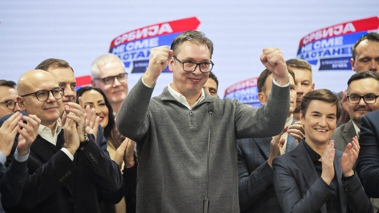 BELGRADE, SERBIA - DECEMBER 17: Serbian President Aleksandar Vucic celebrates as he declared victory in snap parliamentary and local elections held on December 17, 2023. Vucic announced that his Serbian Progressive Party (SNS), which appeared on the ballot under the name “Aleksandar Vucic — Serbia must not stop!,� won the majority of seats in the 250-seat parliament with 46.5% of the vote. Samır Jordamovıc / Anadolu (Photo by Samır Jordamovıc / ANADOLU / Anadolu via AFP)