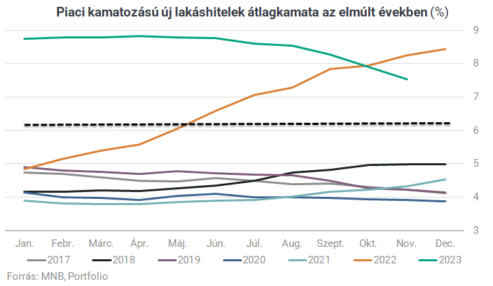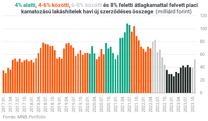 Nem ismerjük a már felvett lakáshitelek kamatszint szerinti pontos eloszlását, ezért nehéz becslést adni arra, hogy hány meglévő lakáshitelnek magasabb most az ügyfél által fizetendő kamatlába az új lakáshitelek esetében már speciális feltételek nélkül elérhető 6,3%-os kamatnál. Az MNB adatai szerint a teljes forintalapú lakáshitel-állomány hó végi állománnyal súlyozott átlagkamata mindenesetre november végén 5,53% volt, vagyis a lakáshitelek többségét jelen (kamatstoppal is érintett) helyzetben vélhetően nem éri meg kiváltani. Az új kihelyezések adatain viszont ennél pontosabban láthatjuk azt, hogy mely hónapban felvett hitelek lehetnek azok a tartozások, amelyek nagy része a most elérhető legalacsonyabb kamat fölé esik.