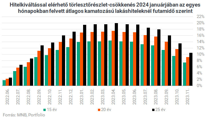 Az utóbbi időszakban felvett lakáshitelek kiváltása révén a törlesztőrészlet most már akár 20%-kal is csökkenhet hosszú, 20-25 éves futamidő mellett, különösen a 2023 első felében felvett lakáshitelekre érvényes ez. E hitelek esetében elveszhet a végtörlesztés miatt az eredeti bank által a hitelfelvétel során elengedett díjak egy része, ám ezekkel együtt is viszonylag rövid távon megtérülhetnek a hitelkiváltás költségei. Ugyanakkor a kamatkörnyezet esetleges további csökkenésére tekintettel nekik is érdemes lehet most még kivárniuk. Hogy mennyit, azt nehéz megmondani.
