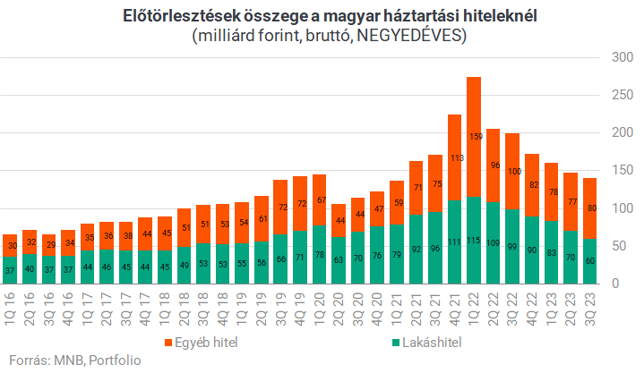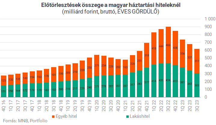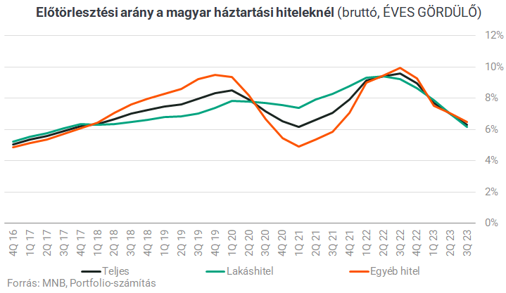 A hitelkiváltások első lábát az előtörlesztés (pontosabban végtörlesztés) jelenti. A bruttó módon figyelembe vett előtörlesztések egy részéből lesz csak hitelkiváltás. A jegybank erre vonatkozó adatai szélesebb körűek, mint a hitelkiváltásokra vonatkozók, és azt mutatják, hogy az utóbbi időben a magas kamatkörnyezet ellenére csökkent az előtörlesztések aránya a lakáshitel-tőketartozások időszak eleji értékéhez képest, vélhetően az előtörlesztési képesség romlott tavaly 2022-höz képest.