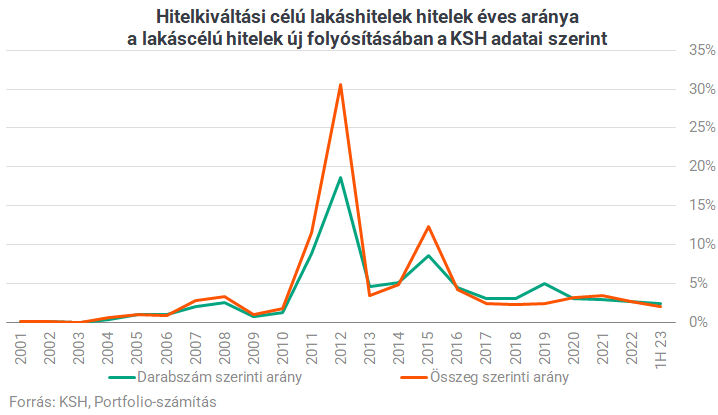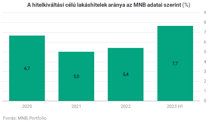 Ennél valamivel magasabb, 5-8%-os arányt mutatnak az MNB számunkra eljuttatott adatai. A különbség mögött statisztikai okok álhatnak, a jegybank adatai teljesebb körűen tükrözhetik a ténylegesen hitelkiváltási céllal felvett lakáshiteleket.