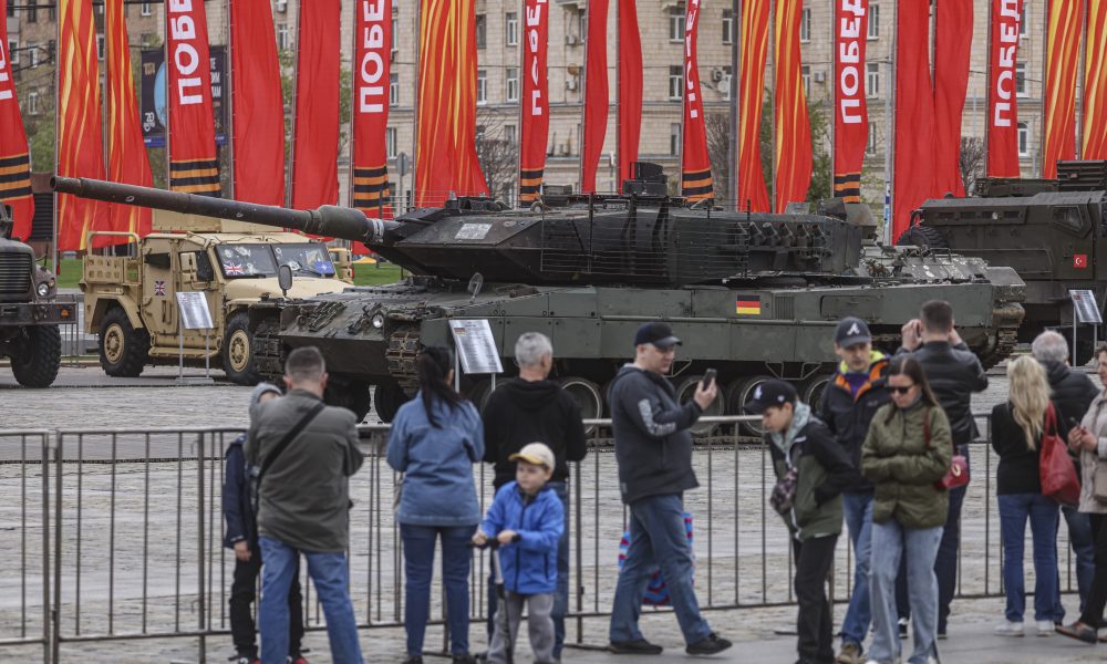 Páncélozott harcjármûvek elõtt egy nõ az Ukrajna elleni orosz háborúban zsákmányolt fegyverzetek kiállításán a moszkvai Poklonnaja-dombon 2024. április 28-án. A több mint harminc amerikai, brit, német, francia, török, svéd cseh, dél-afrikai, finn, ausztrál osztrák és ukrán harceszközt egy hónapig nézhetik meg az érdeklõdõk. MTI/EPA/Szergej Ilnyickij